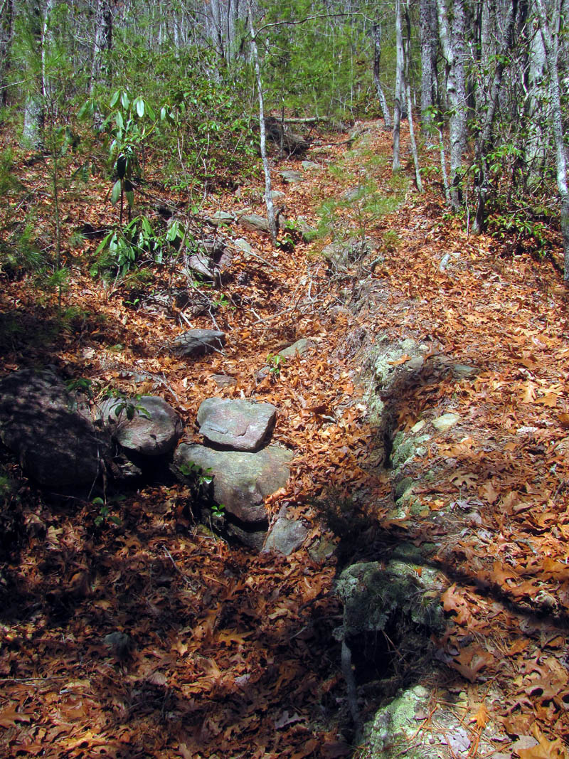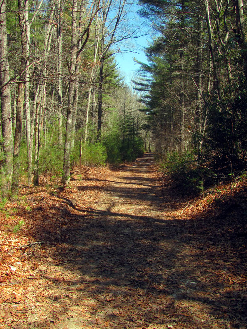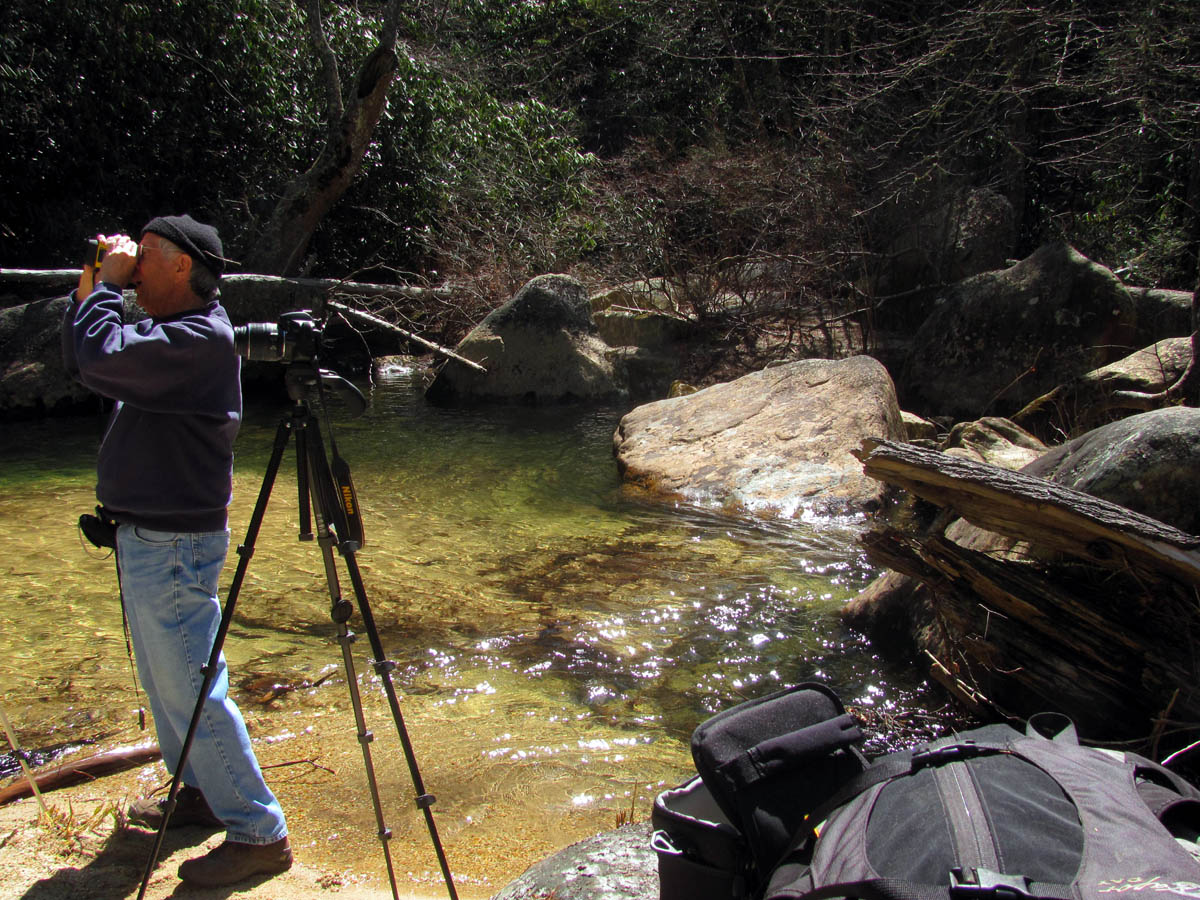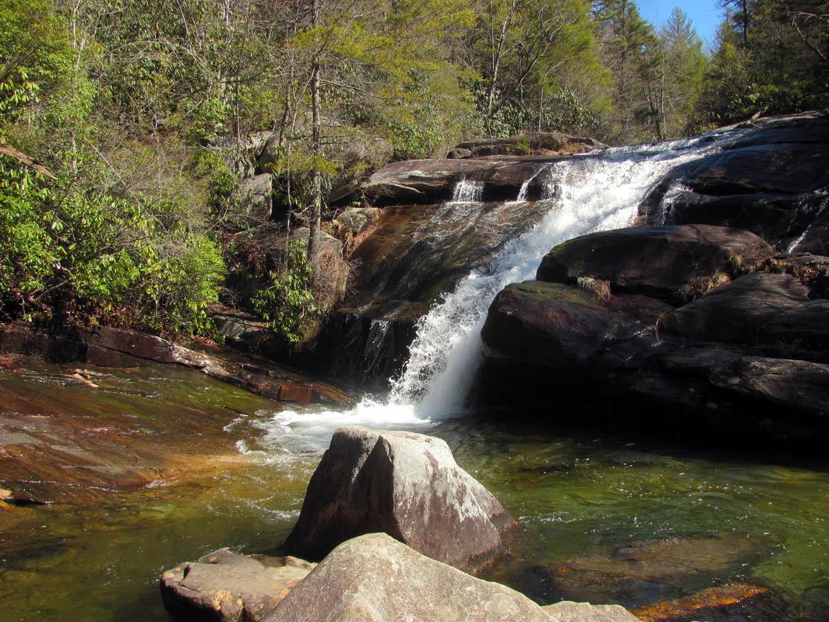 For years I have heard about the ‘Land of the Waterfalls’ in Transylvania County of North Carolina (called this due to some 250 different waterfalls located there), some of them are located in the DuPont State Forest. It is also called ‘Home of the White Squirrel‘ (as they actually do have white squirrels there !) and I finally got to take my first trip there on Wednesday, March 27, 2013. My waterfall crazy friend Dave Aldridge invited me along on an exploration trip he had planned to find an unnamed and unlisted waterfall within the DuPont State Forest that he had found by looking at a satellite view of the area. He had discovered a way down to the top of them the week before, but was unable to get down to the bottom of them so it was our quest to find a way there. Dave knew that these unknown falls were just above a very well known and listed falls called Wintergreen Falls so we took what we thought would be an easier route to those falls and then looked for a passable route to get upstream to the falls we were searching for. Having seen an old road trail on the map, we easily found that and parked at a locked gate there and proceeded down this nice road trail towards the Wintergreen Falls. It is about a mile and a half to these falls by this route. There is a short rock hop to reach them. They are only about 20 feet high so they are the least impressive falls within the park but they are nice and besides, we were in search of a much larger one upstream from there.