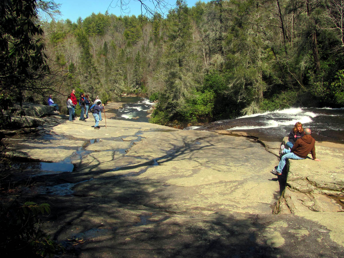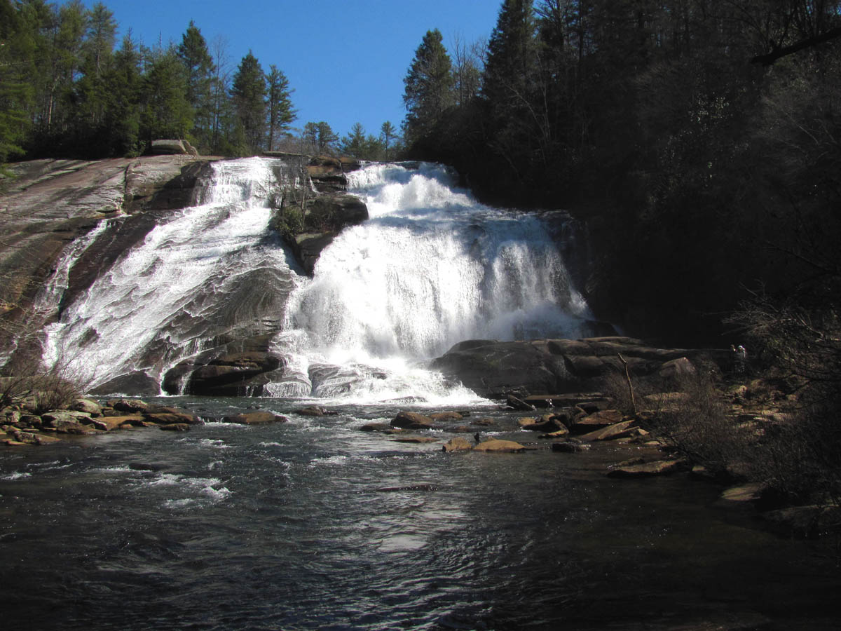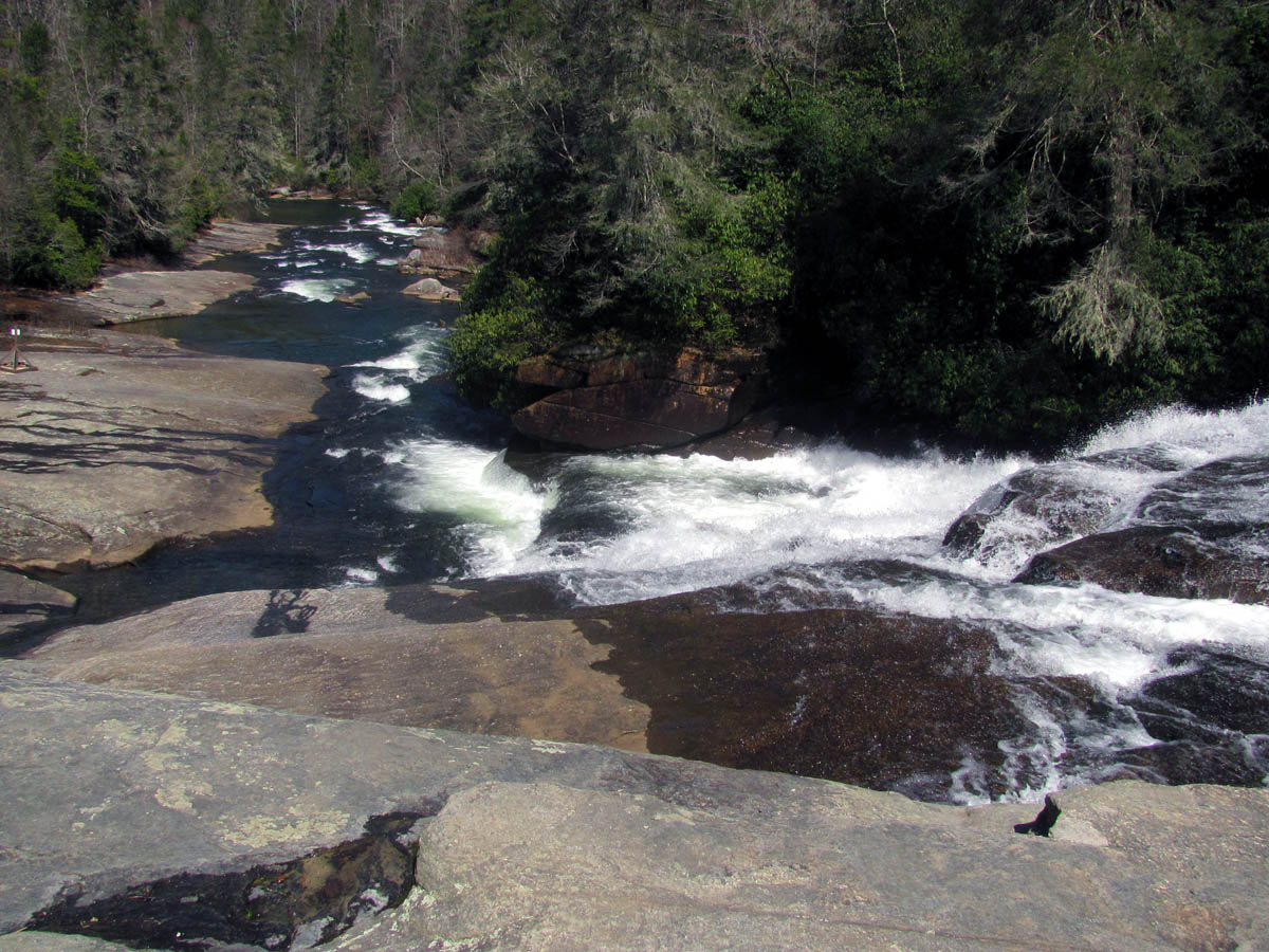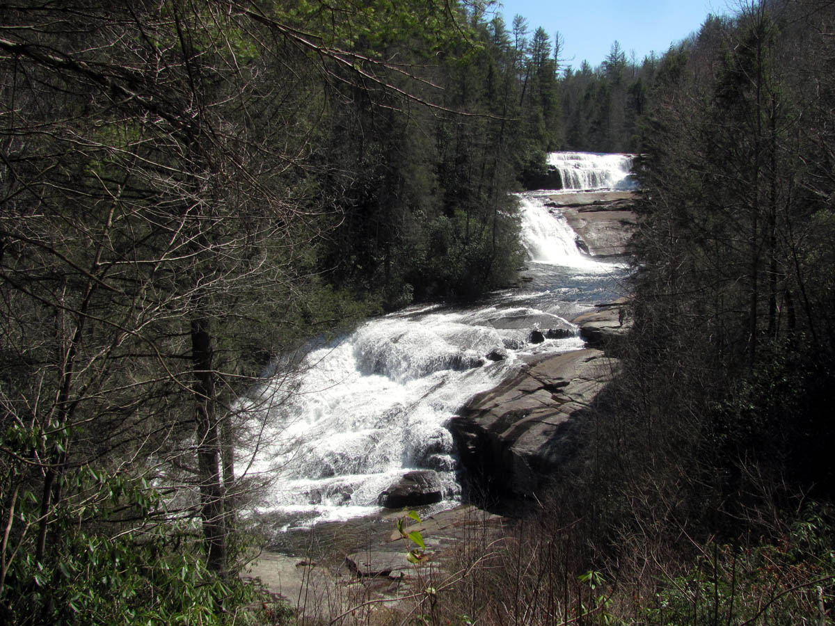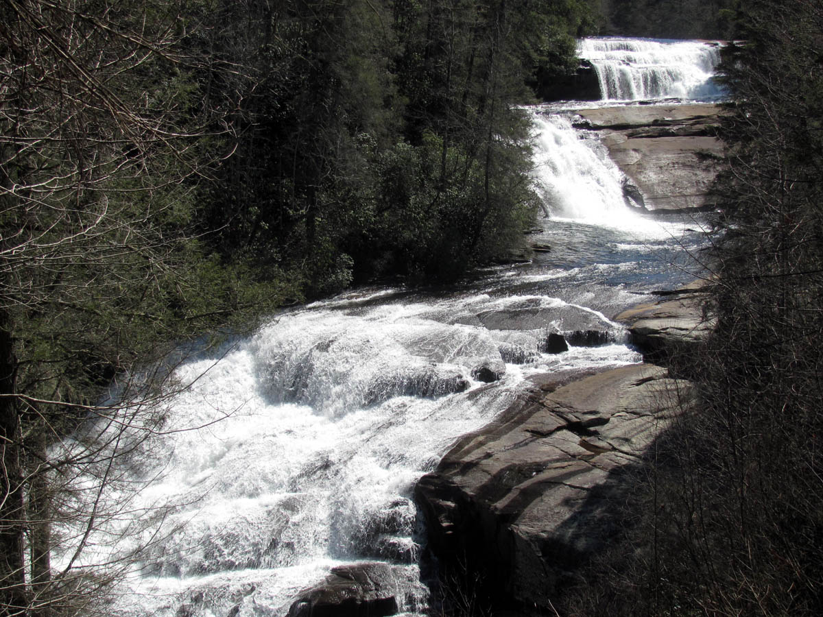 From there we made our way back kinda the way we had came but, I did venture higher on the ridge in search of a better path which I did find. I was soon looking down on Wintergreen Falls from high above just before reaching the old road trail we came in on. After doing the mile and a half of that road, we were back at the car and decided to see if we could make it to the Triple Falls and High Falls before we ran out of time. It is possible to see the 6 listed waterfalls of DuPont State Forest in one day but, you would have to hustle and not spend much time at any of them. I would recommend taking some time to enjoy them all, perhaps a camping trip for a few days. It was a short drive around to the parking lot where Hooker Falls is and a short walk to the Triple Falls. These are always crowded with people due to the easy access but, they are very impressive. Triple Falls is listed as 125 feet high but there are three tiers so it seems much higher to me. We did not take the time to measure any of them on this trip as we were pressed for time. The water level was definitely at a record high so it was breathtaking to see despite the bright sun that made any attempt of a good photo to fail. I got the best i could of the three falls from the trail before continuing up the hill to where the wooden steps lead down to the base of the upper set of falls.
