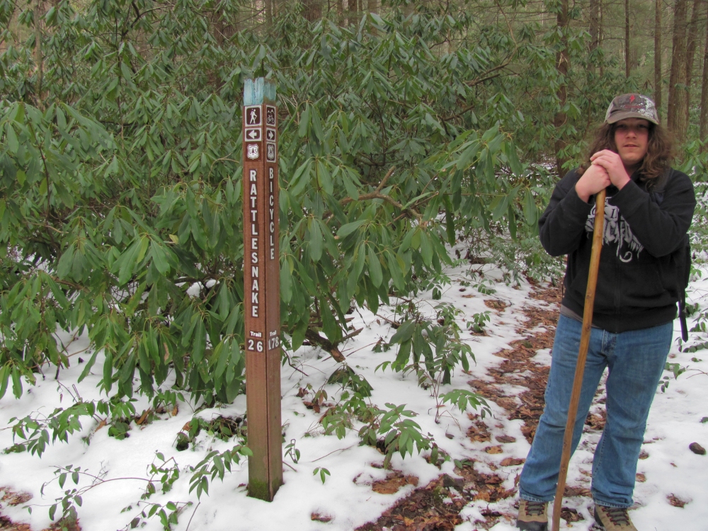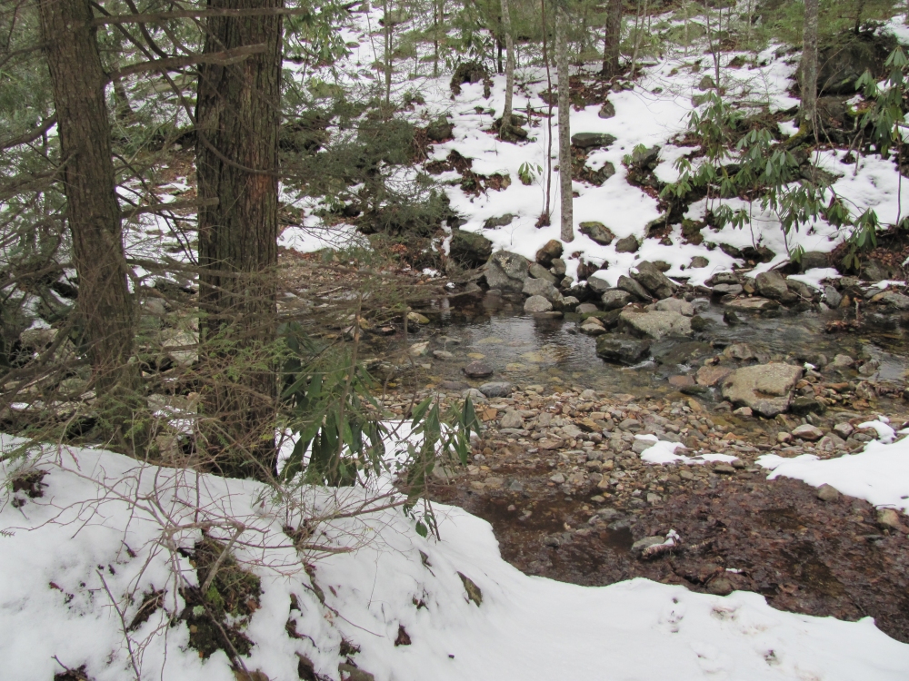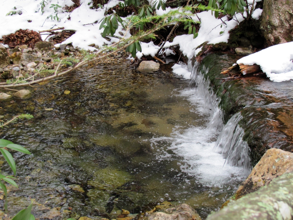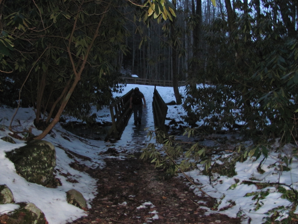 Finally the temperatures have risen enough to get out on my first adventure of the new decade. I decided to lead an adventure to Dick Creek Falls from the Rock Creek side, along with my son Tyler and good friend Bol’Dar. As usual, we got a late start so we did not leave Hairnt-quarters until around noon. Snow was still visible on the mountains as we drove to Erwin and we hiked on it from the gate where we parked, all the way to the falls and back. It was not deep enough to be cumbersome, except for the ‘shortcut‘ we took on the way back where it was a bit deeper, but we decided we needed some extra adventure anyway! The swimming area in the park was still somewhat frozen.