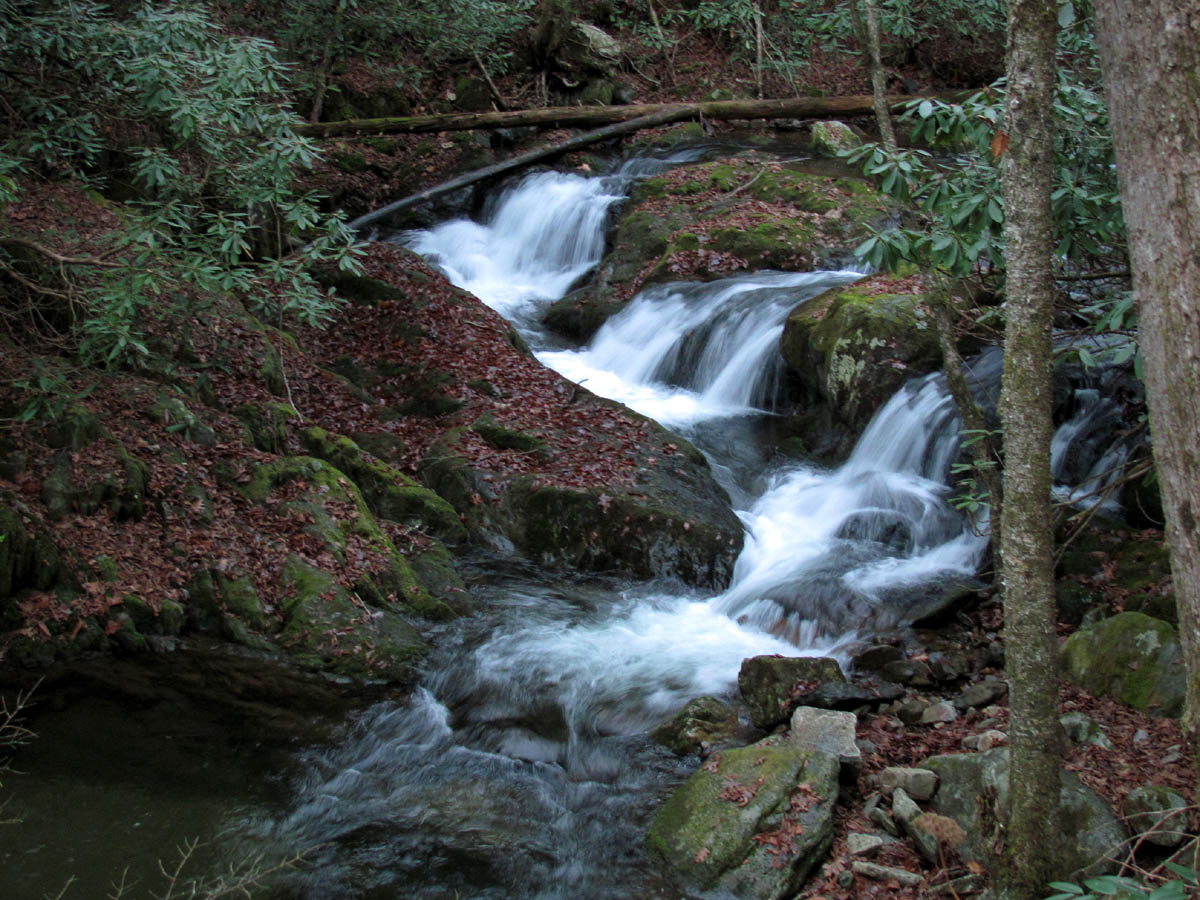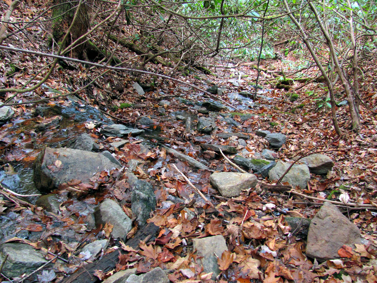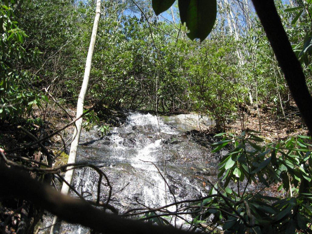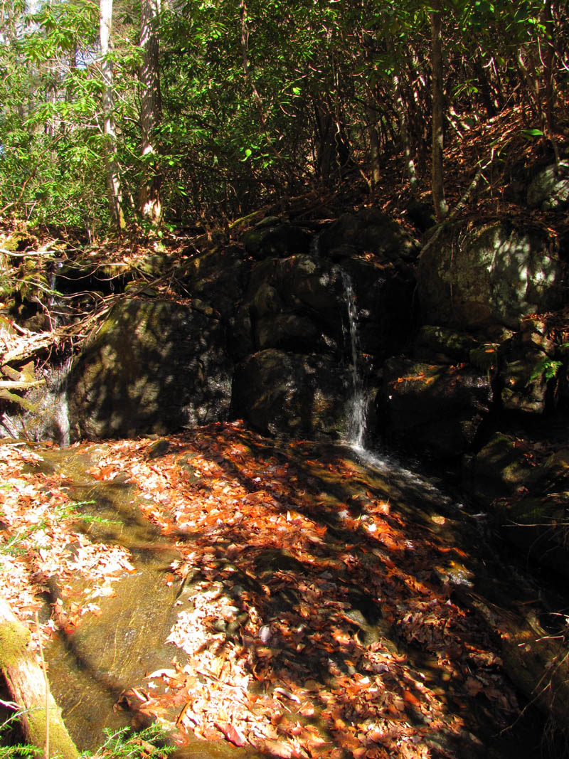 The first ‘split’ is not quite a half mile from the ‘high road’ and taking the right fork, you will soon come to the first of the lower falls (as listed by TN. Landforms).