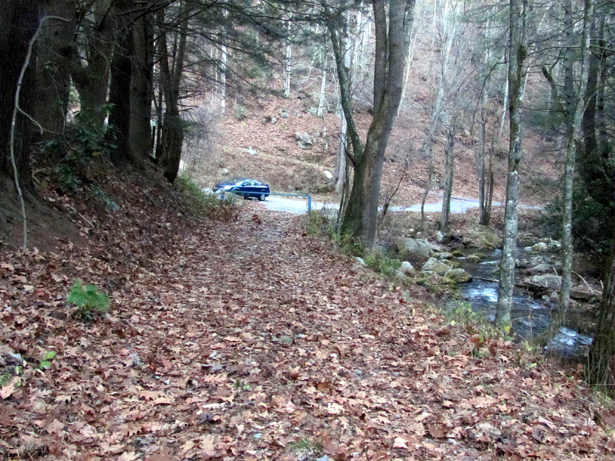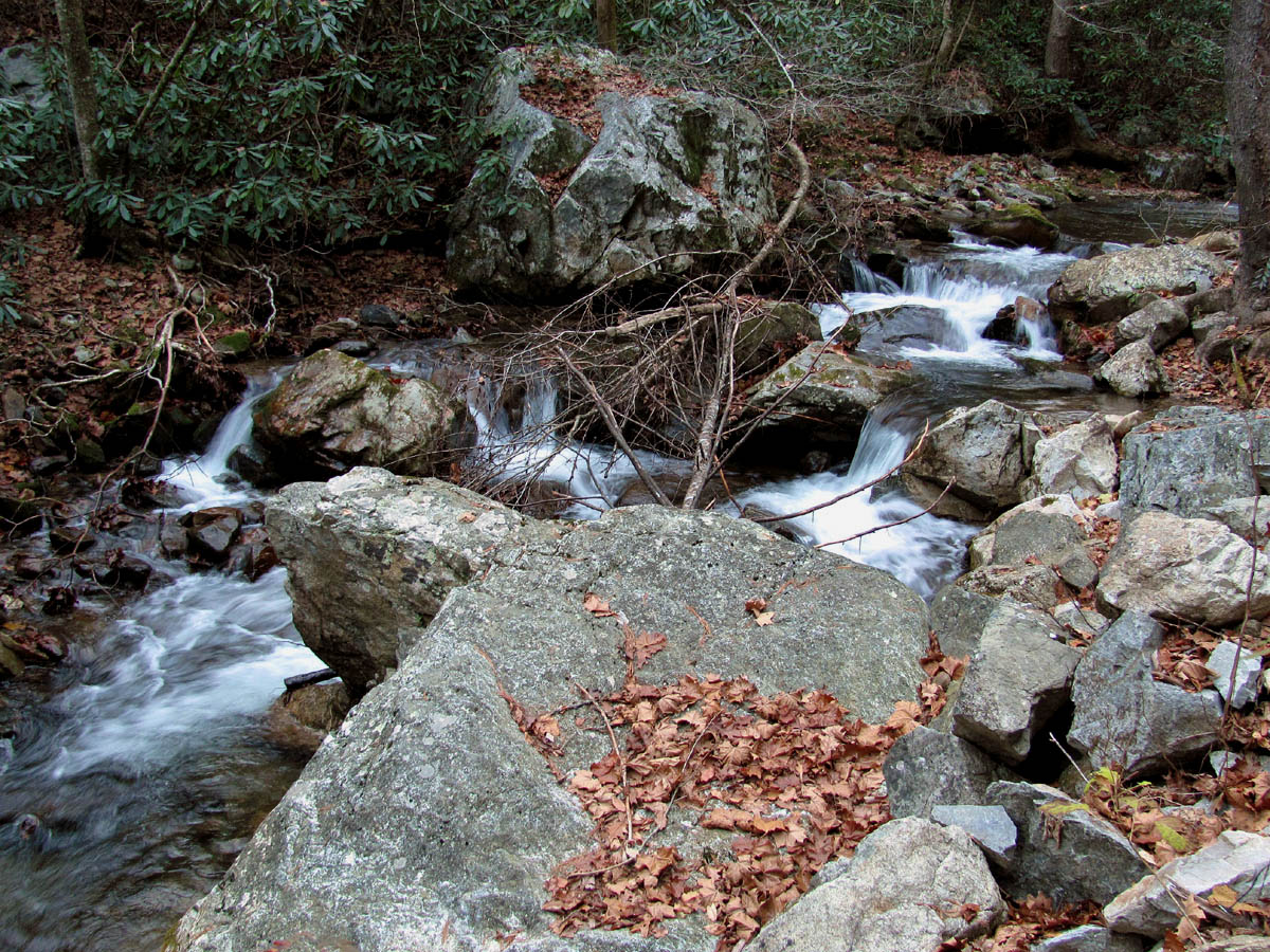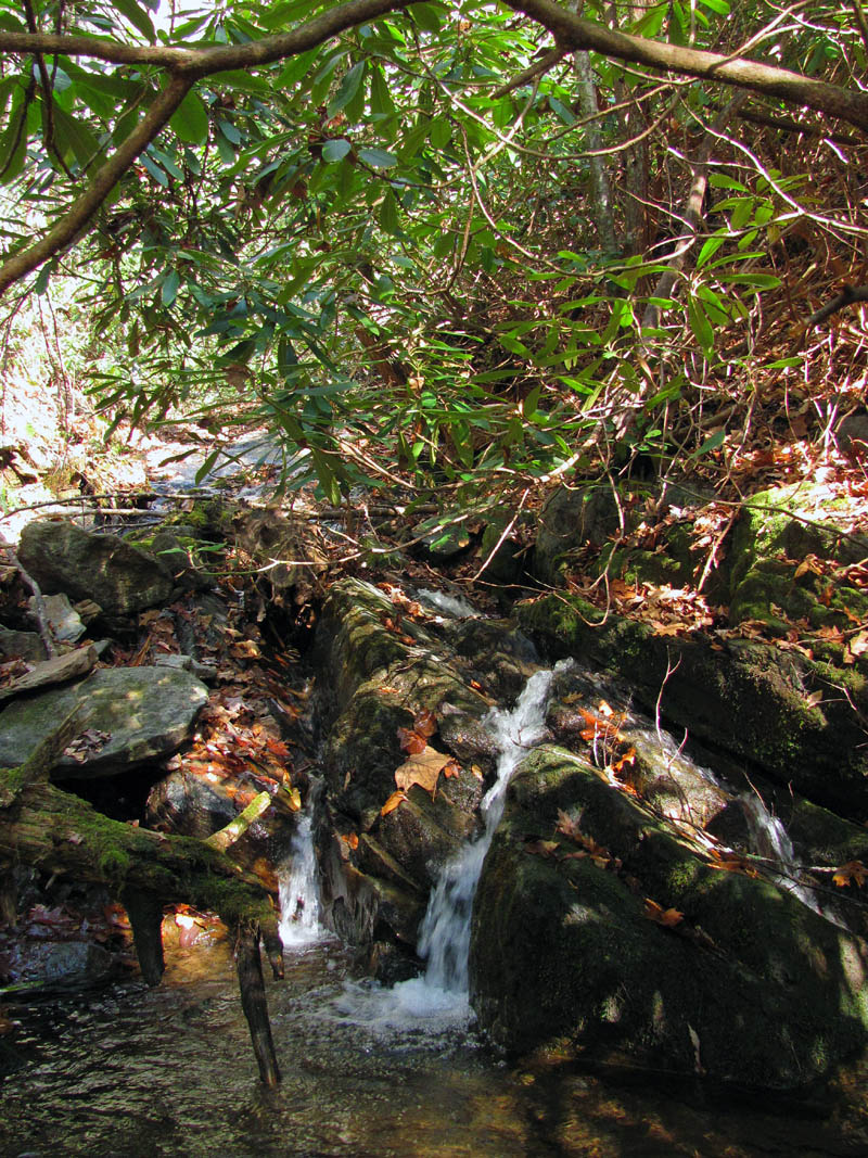 The first ‘split’ is not quite a half mile from the ‘high road’ and taking the right fork, you will soon come to the first of the lower falls (as listed by TN. Landforms).