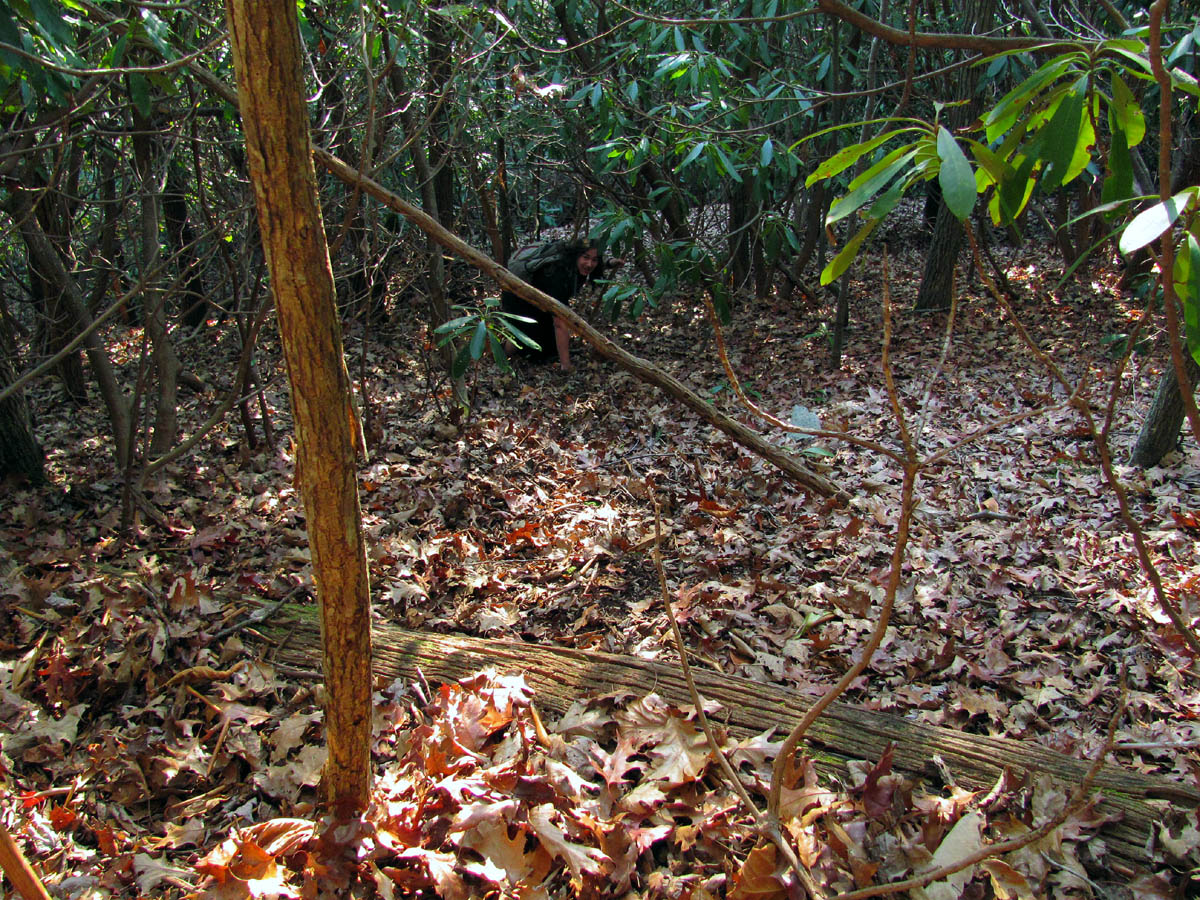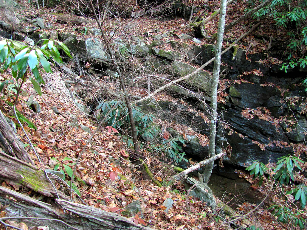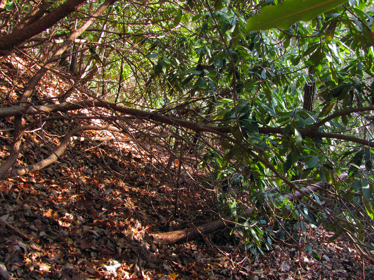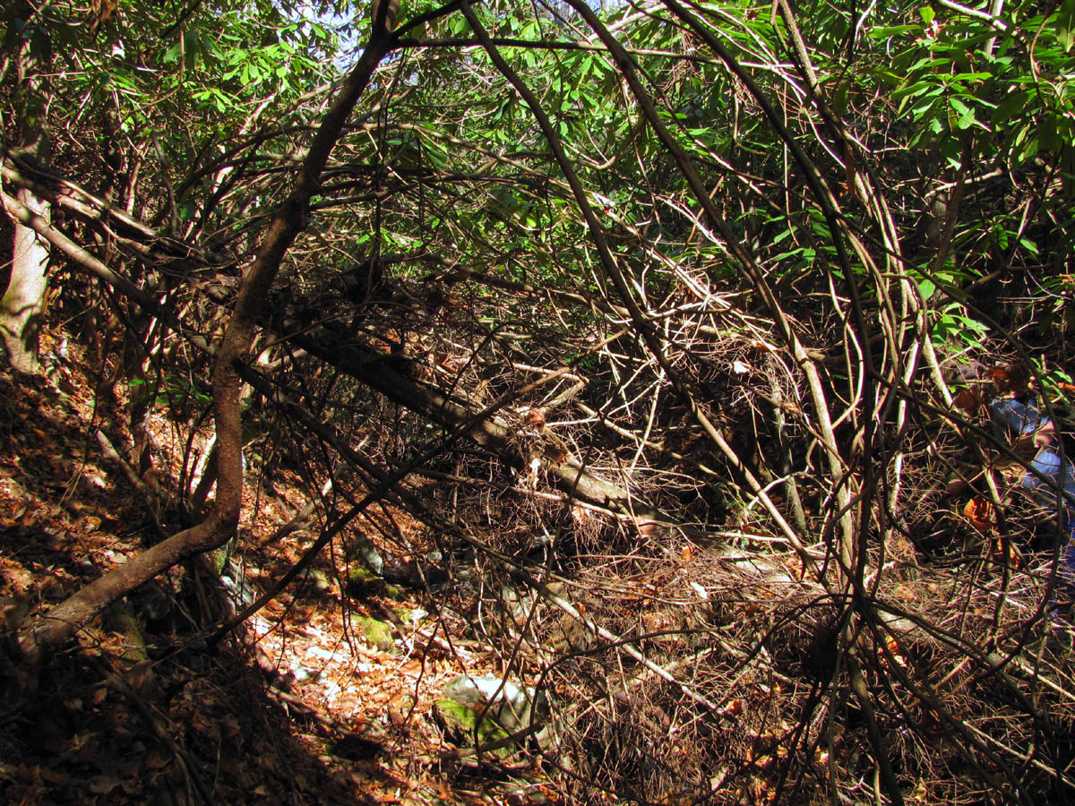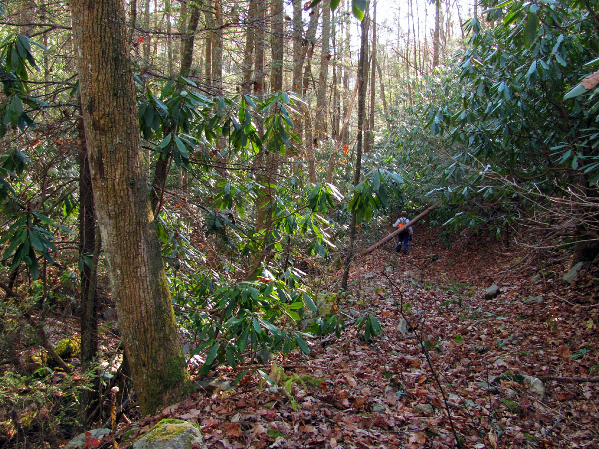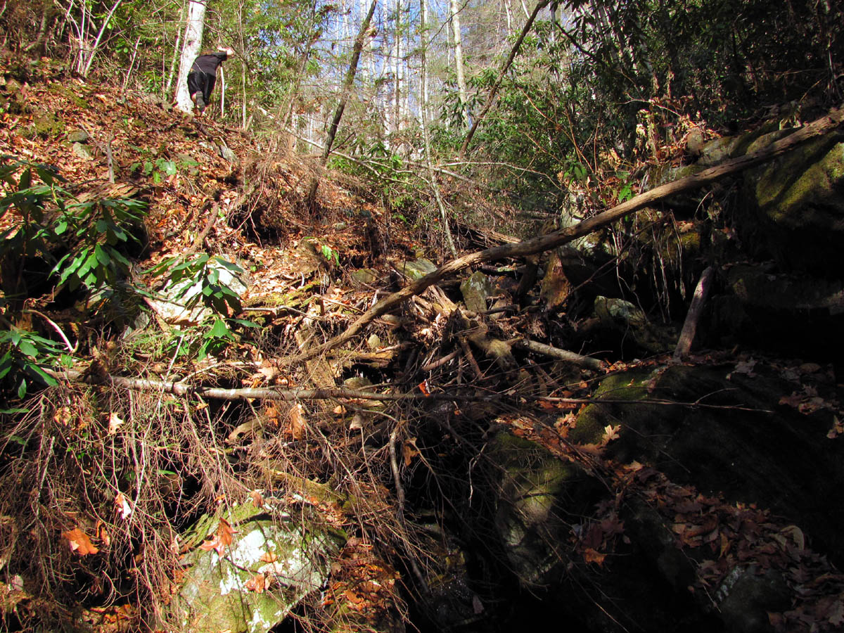 The old log road was very overgrown and had obviously not seen much travel in a long time, but it was definitely way better than going back down the rough and steep creek bed. We continued on it until it reached the point of the ridge and started curving left beyond the point where we needed to exit. It was also way above the creek where we came in at so we needed to lose a considerable amount of elevation at this point. Knowing we needed to go down here but seeing how steep it was, not to mention the laurels had become incredibly thick, we had to stop and wonder if we could even get through them. Bol’Dar went to investigate and slipped on the incredibly steep slope, dropping his hiking staff which went like a bullet to the bottom, so we were then committed to going down there ! Once we negated the thick laurels, it opened up somewhat and we could then see another old log road further below us. Tyler took off sliding and within seconds was at the bottom ! It was fun ‘sliding for life’ down this leaf covered hill.