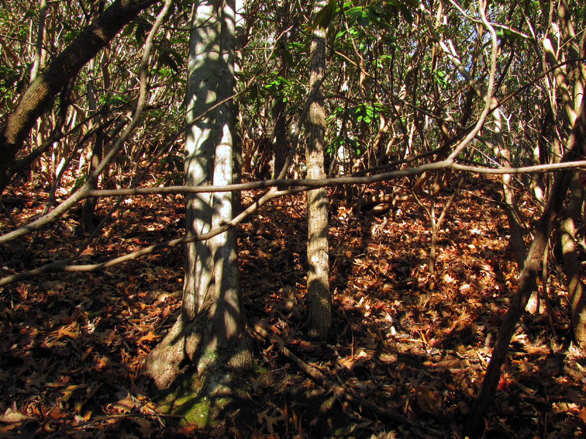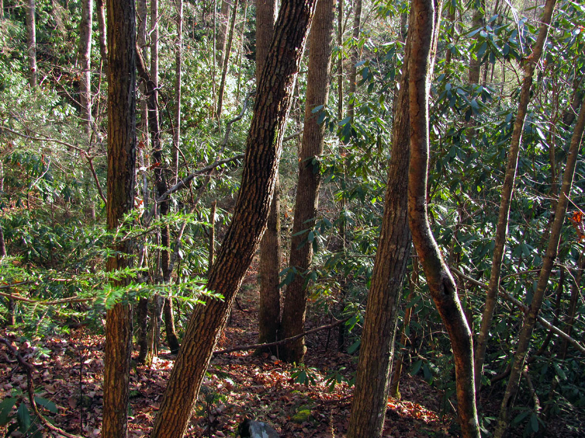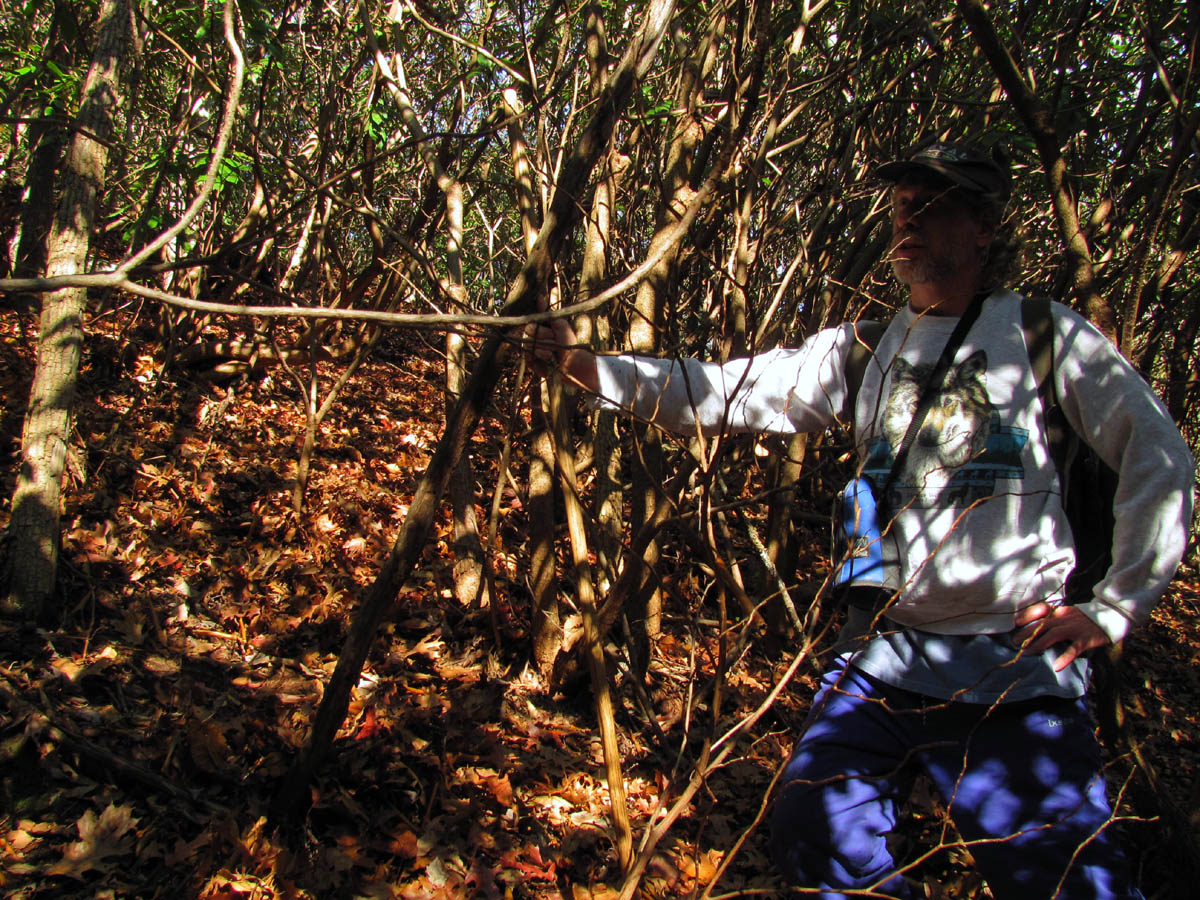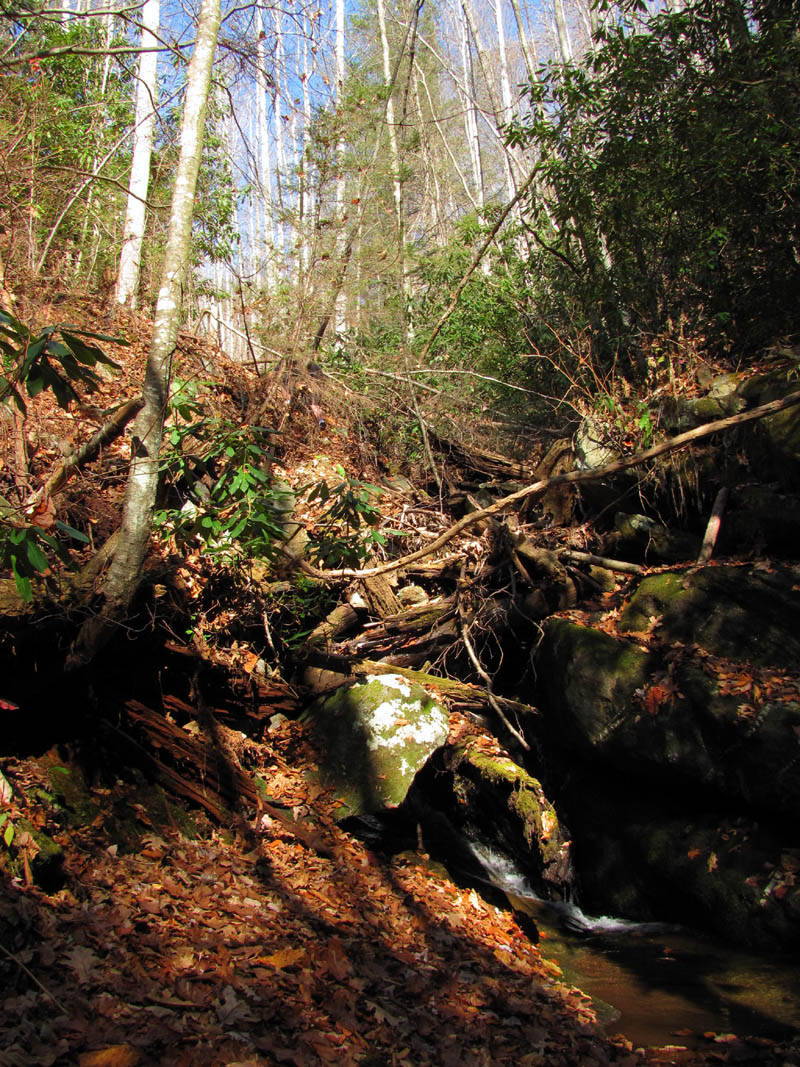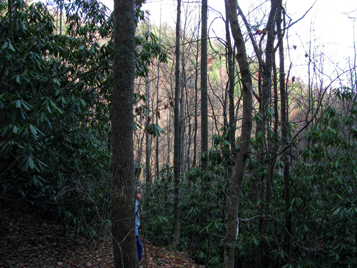 The old log road was very overgrown and had obviously not seen much travel in a long time, but it was definitely way better than going back down the rough and steep creek bed. We continued on it until it reached the point of the ridge and started curving left beyond the point where we needed to exit. It was also way above the creek where we came in at so we needed to lose a considerable amount of elevation at this point. Knowing we needed to go down here but seeing how steep it was, not to mention the laurels had become incredibly thick, we had to stop and wonder if we could even get through them. Bol’Dar went to investigate and slipped on the incredibly steep slope, dropping his hiking staff which went like a bullet to the bottom, so we were then committed to going down there ! Once we negated the thick laurels, it opened up somewhat and we could then see another old log road further below us. Tyler took off sliding and within seconds was at the bottom ! It was fun ‘sliding for life’ down this leaf covered hill.