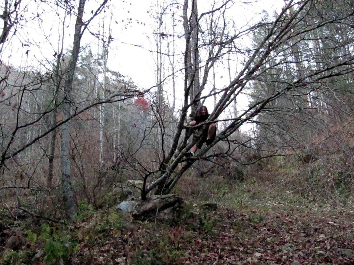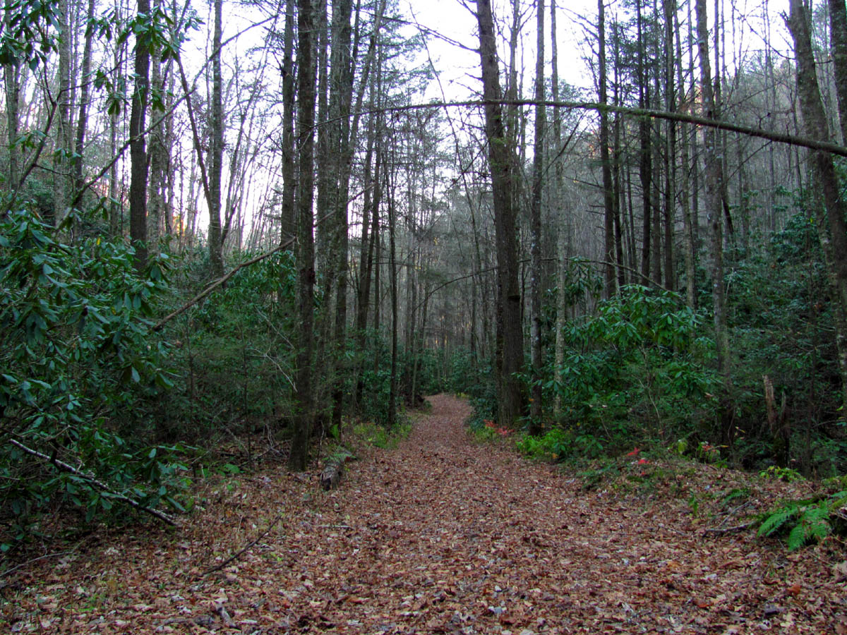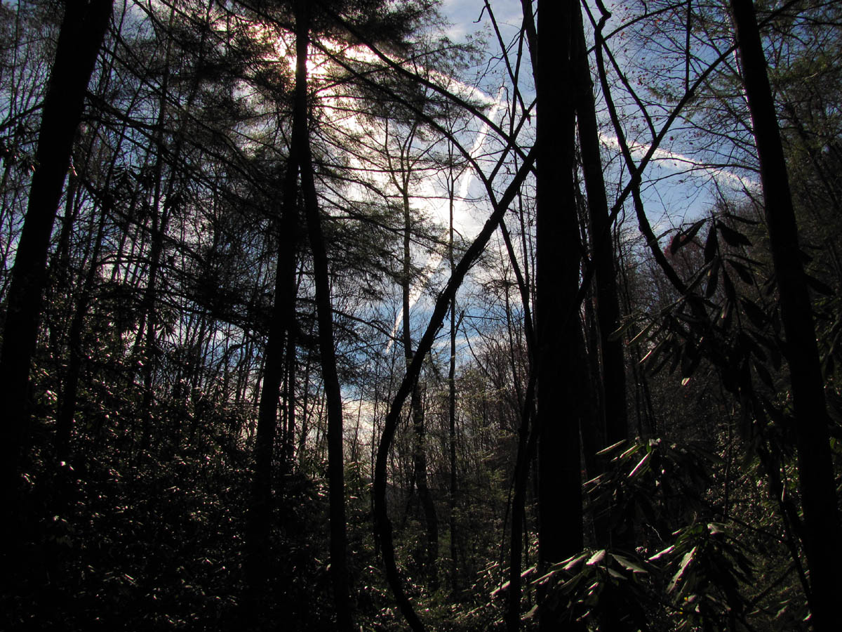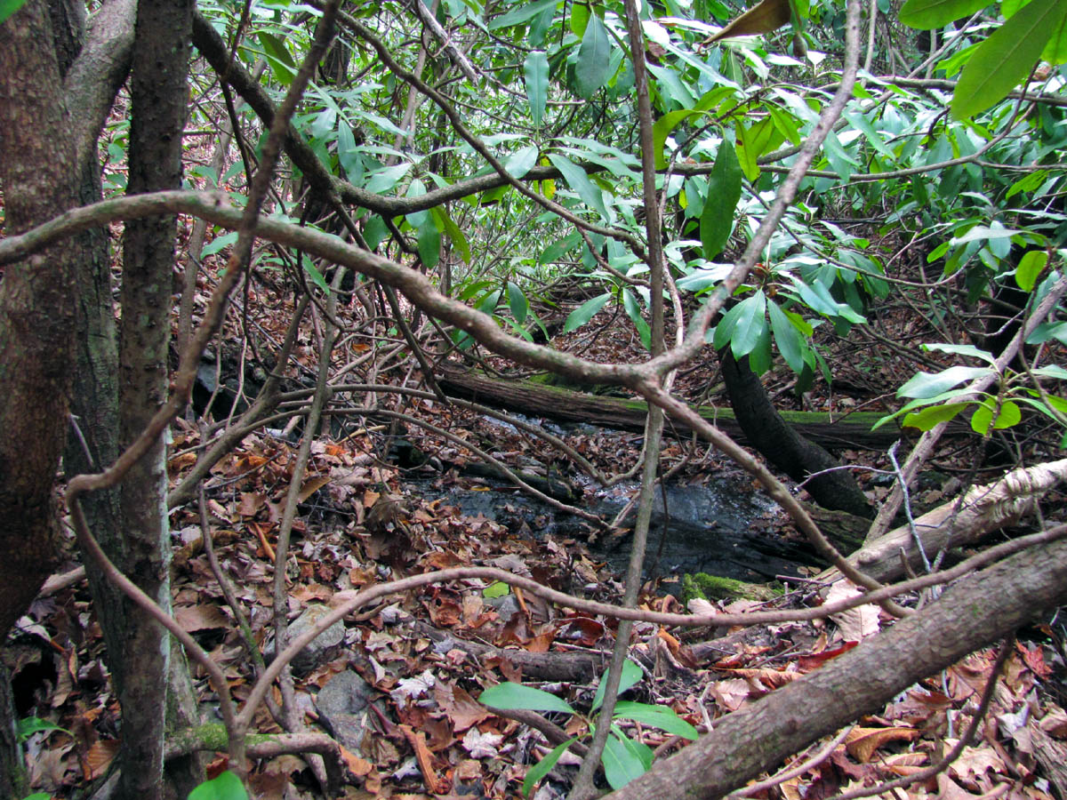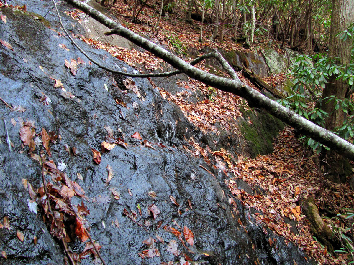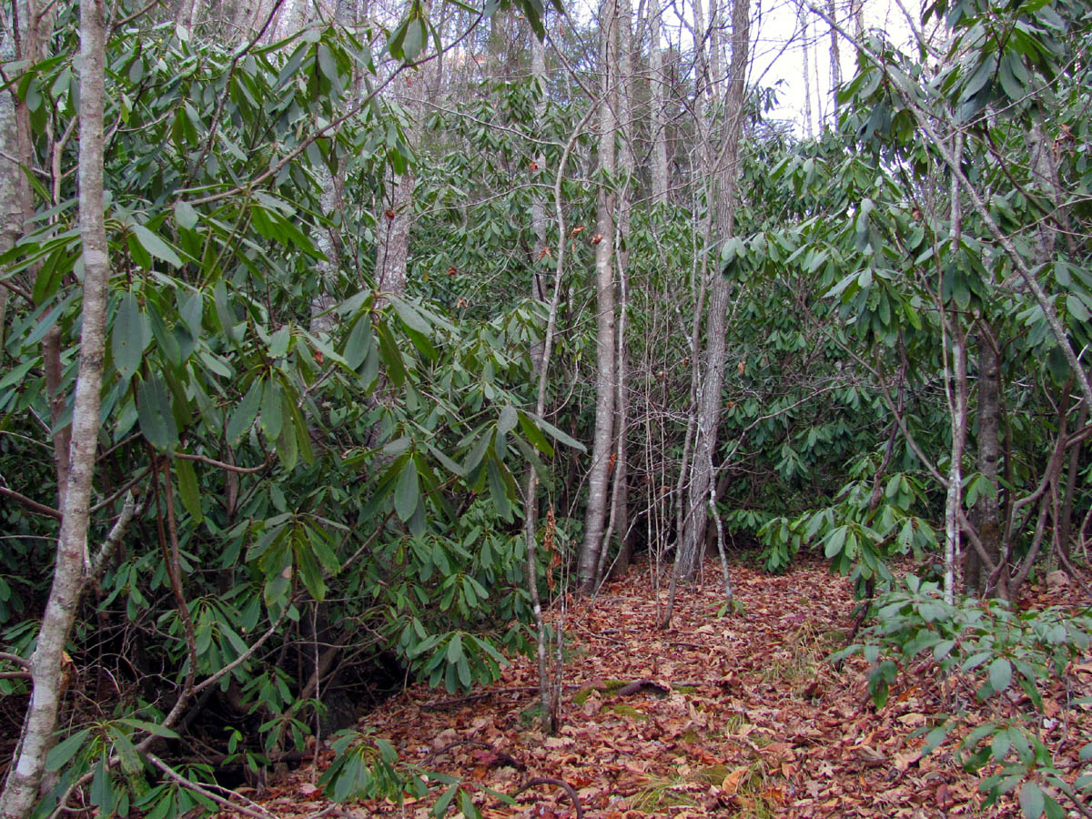The old log road was very overgrown and had obviously not seen much travel in a long time, but it was definitely way better than going back down the rough and steep creek bed. We continued on it until it reached the point of the ridge and started curving left beyond the point where we needed to exit. It was also way above the creek where we came in at so we needed to lose a considerable amount of elevation at this point. Knowing we needed to go down here but seeing how steep it was, not to mention the laurels had become incredibly thick, we had to stop and wonder if we could even get through them. Bol’Dar went to investigate and slipped on the incredibly steep slope, dropping his hiking staff which went like a bullet to the bottom, so we were then committed to going down there ! Once we negated the thick laurels, it opened up somewhat and we could then see another old log road further below us. Tyler took off sliding and within seconds was at the bottom ! It was fun ‘sliding for life’ down this leaf covered hill.